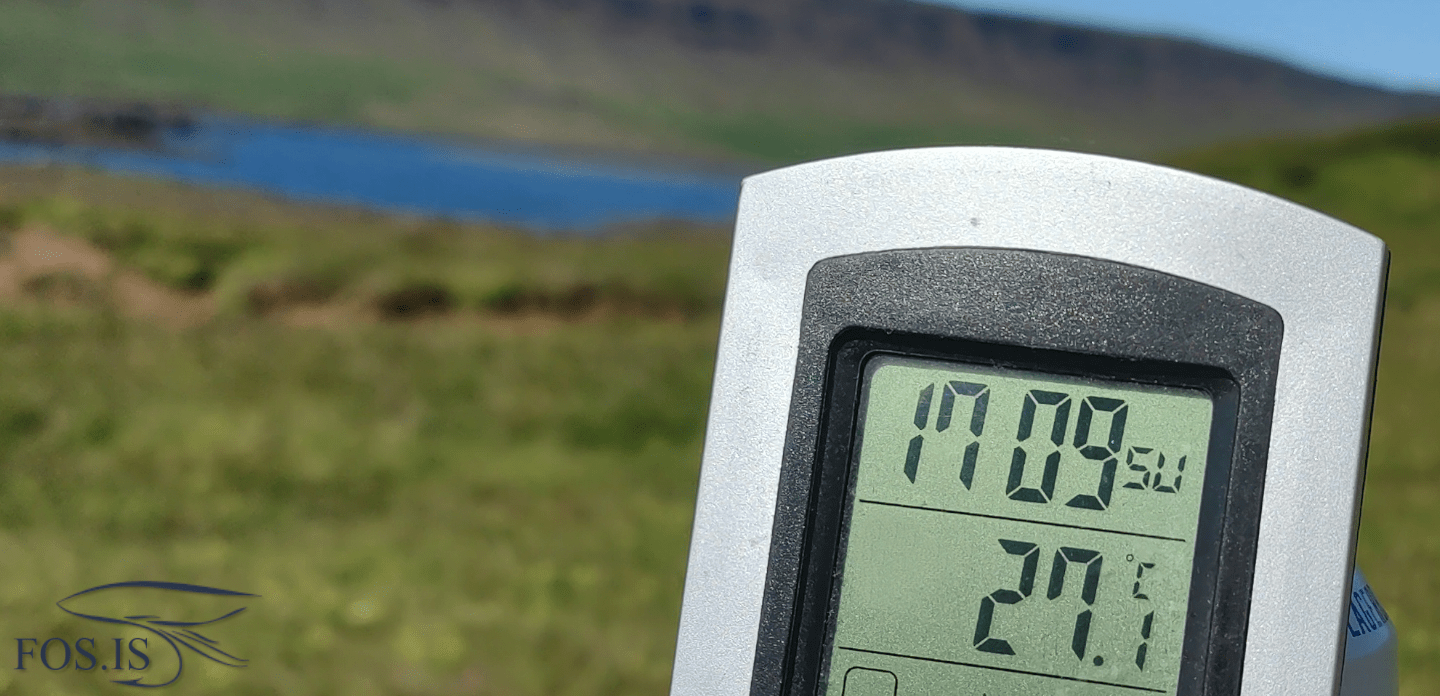 Stærð fiskanna var alveg frá því að vera Æ, nú er gróður á flugunni og upp í Þennan er nú alveg hægt að hirða, stærri voru þeir nú ekki. Þessi skortur á vænum fiskum vakti hjá mér spurninguna um það hvort stærri fiskurinn sé viðkvæmari fyrir hækkandi vatnshita heldur en sá smærri. Almennt var hitastig vatnsins frá 12 til 14°C og lækkaði lítið að kvöldi til sem gæti skýrt það að fiskur fór ekkert stækkandi þótt komið væri að sólarlagi.