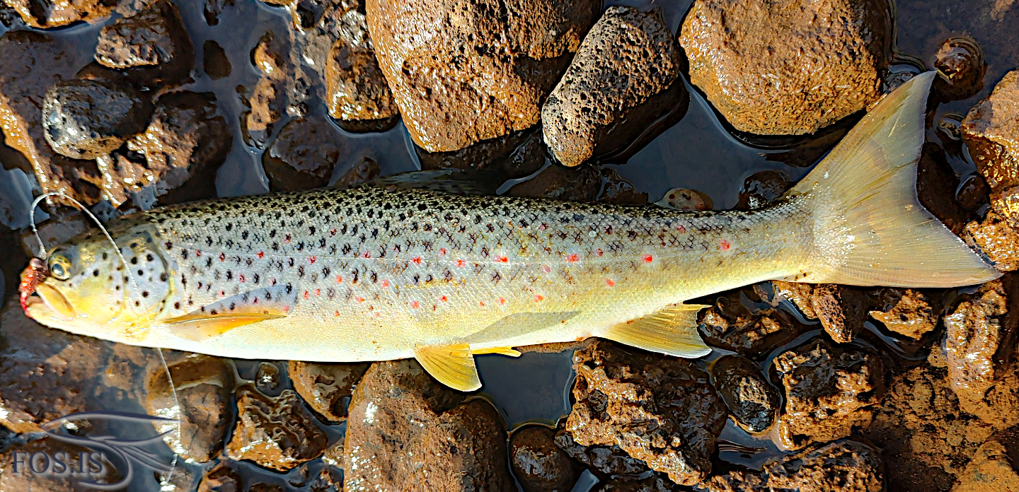 Ég eyddi töluverðum tíma í að þræða Hraunið með þristinn minn í farteskinu og það er óhætt að segja að það er fiskur í öllum víkum, krókum og kimum sem eiga samgang við vatnið sjálft. Það kom skemmtilega á óvart að flestir fiskarnir sem ég flokkaði í Þennan er nú alveg hægt að hirða var að finna í Hrauninu og þeir voru alveg bráð skemmtilegir á létta stöngina. Eina sjáanlega afrennsli vatnsins þegar ekki rennur um Hraunholtaá er undir hraunið og það var töluverður straumur á milli pollanna, allt þar til það hvarf um gjótu eða bara beint inn í hraunið. Alltaf jafn magnað að sjá hve rennslið er mikið.