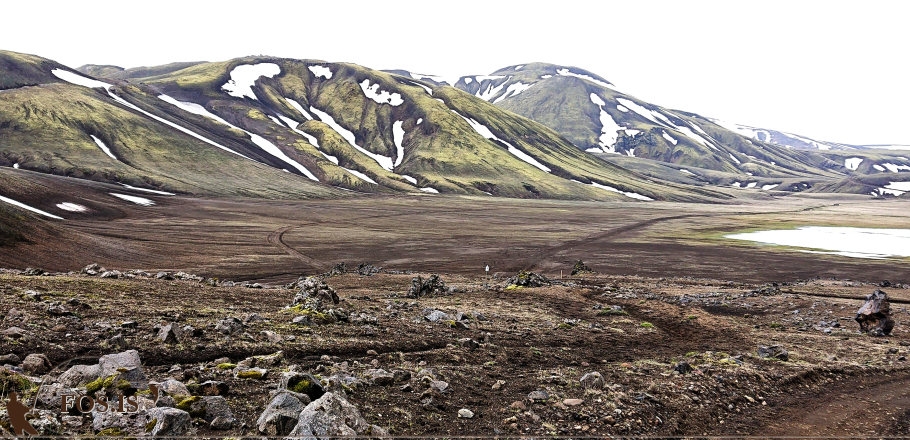 Hér kemur svolítill kafli um akstur og ferðalög á þessum slóðum. Skafl eins og þessi við Landmannahelli er eflaust fær stærri bílum, en til að komast yfir hann þarf að fara upp og aftur niður. Þar mætir harðfennið mjög gljúpum jarðvegi og oft grónu landi. Það er blautt undir og þessi jarðvegur, hvernig sem hann er, skerst auðveldlega og tætist upp. Sumarið er sérstaklega stutt uppi á hálendi Íslands og ein ógætileg bílför geta skilið eftir sig ör til áratuga ef ekki er varlega farið. Ég skil vel óþreyju ferðalanga eftir því að komast um hálendið, en það ætti að vera einhverra daga virði að bíða þannig að umhverfið beri óþolinmæðinni ekki merki í áratugi. Meira að segja það sem virðist við fyrstu sýn vera grófur melur getur verið þunn skán og undir gljúpur sandur eða leir þannig að hann skerst í sundur og bílar festa sig með tilheyrandi veseni og miklum skemmdum. Vinsamlegast virðið tilmæli land- og skálavarða á hálendinu og hlífið gróðri og torfærum slóðum rétt á meðan sumarið nær yfirhöndinni í þennan skamma tíma sem það varir. Þó ekki séu alltaf skýrar lokanir í gangi þá ætti skynsamleg hugsun að nægja til að hverfa frá ef fyrirséð er að skemmdir verða á gróðri eða slóðar of blautir.