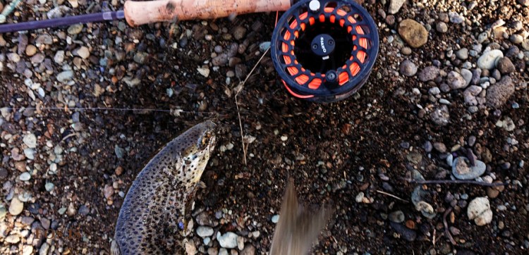 Það var svo við síðustu skiptingu okkar veiðifélaganna að ég setti í og landaði mínum fyrsta fiski í Varmá og þar með fyrsta fiski sumarsins. Þetta var rétt fyrir neðan Teljarann, en þar höfðum við séð eitthvað af fiski á ferðinni í byrjun dags. Þetta var ekki stór fiskur, en sprækur og fallegur. Samkvæmt lögum og reglum var honum vitaskuld sleppt eftir að ein og hálf mynd hafði náðst af honum og svartur Dýrbíturinn hafði verið losaður úr honum.