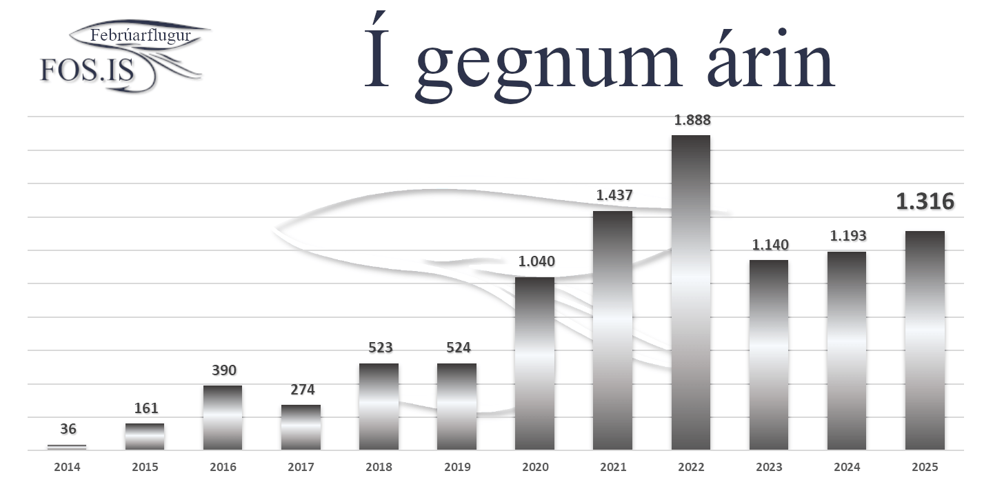 Vöxtur Febrúarflugna í gegnum árin hefur verið langt, langt framar vonum og ég hef sannast sagna alveg eins átt von á að fjöldi flugna hafi náð hámarki sínu á hverju ári frá 2018 þegar þær náðu því að verða 523, en áfram hafa þær vaxið og dafnað. Talnaglöggir sjá að í heildina hafa 9.922 flugur komið fram í Febrúarflugum frá upphafi, það er slatti.