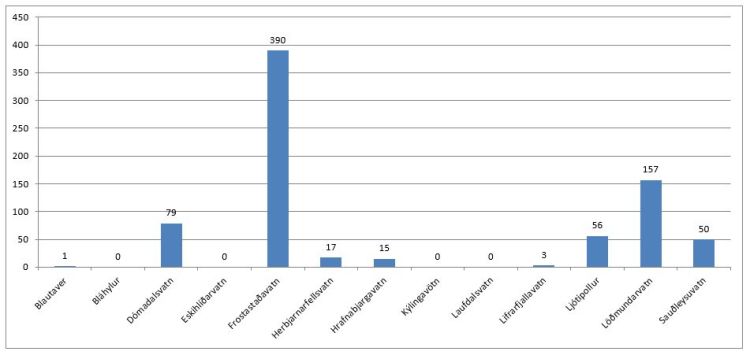 Eins og við mátti búast var Frostastaðavatn með flesta fiska þetta árið, rétt eins og síðustu árin. Samt sem áður eru tölurnar núna ekki svipur hjá sjón miðað við síðustu ár, raunar þær lægstu sem sést hafa frá árinu 2010. Eins og flesta rekur minni til, hamlaði Nýipollur nokkuð ferð manna inn að Froststaðavatni lengi frameftir sumri, í það minnsta þeim sem lögðu leið sína um Landmannaleið og getur að skýrt þessar lélegu aflatölur að einhverju leiti.