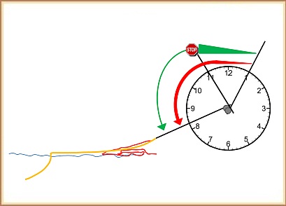 5 Haltu stönginni í fasti stöðu þar til þú finnur að línan hefur rétt úr sér. Létt átak línunnar gefur þér til kynna að nú sé lag að hefja framkastið með jöfnu, stigvaxtandi átaki fram til kl.11 þar sem þú stöðvar hana ákveðið….