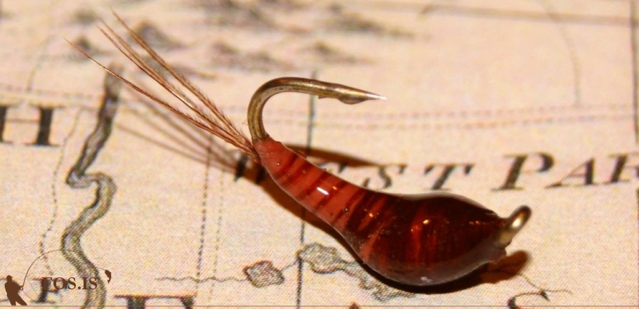 Að þessu sinni var allt annað uppi á teningnum, ekki litið við flugum á botninum enda var fluga á vatninu og víðast hvar var fiskur í uppitöku. Mér varð ósjálfrátt hugsað til flotlínunnar og ævintýrisins við Svartárós, en ég valdi að þessu sinni töluvert minni flugu og af öðrum toga. Frændur Kvíslaveitu urriðans, þeir sem eiga heima í Veiðivötnum, voru ansi sprækir þegar ég sýndi þeim sérlega einfalda kopar- og svartlitaða flugu fyrr í sumar. Eftir að hafa krafsað mig í gegnum nokkur box fann ég þá sem ég hafði í huga; óþyngd fluga með koparbúk og væng úr svartri lambsull.