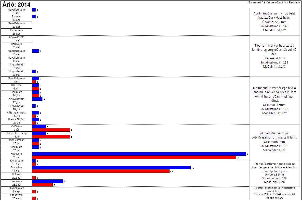 Heilt yfir má segja að sumarið 2014 hafi verið eitt besta ár í veiðinni sem komið hefur í langan tíma hjá mér. 25 ferðir færðu mér 121 bleikju og 27 urriða. Meðalveiði í ferð voru því tæplega 6 fiskar. Munar þar lang mestu um úthald okkar hjóna í Framvötnum í júlí og ágúst. Frúin endaði sömuleiðis í 121 bleikju, en urriðarnir voru eilítið færri eða 18. Aftur á móti var meðalveiði hennar í ferð ríflega 6 stk. þannig að enn og aftur hefur hún vinninginn og er vel að honum komin.
